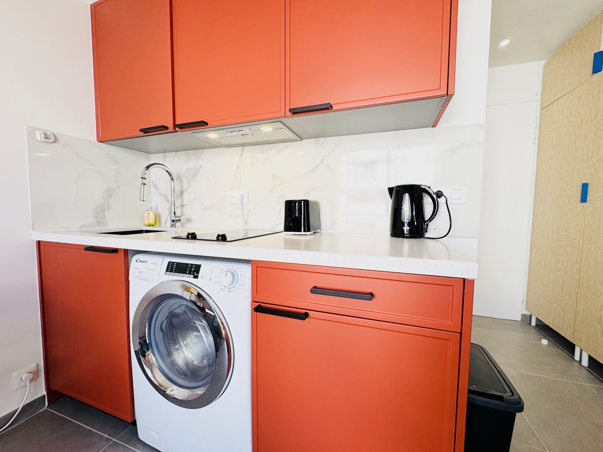 Le logement dispose d’un canapé lit de 140×200, d’un placard pour vos affaires, d’une machine à laver avec à disposition un étendoir, une planche à repasser ainsi qu’un fer.