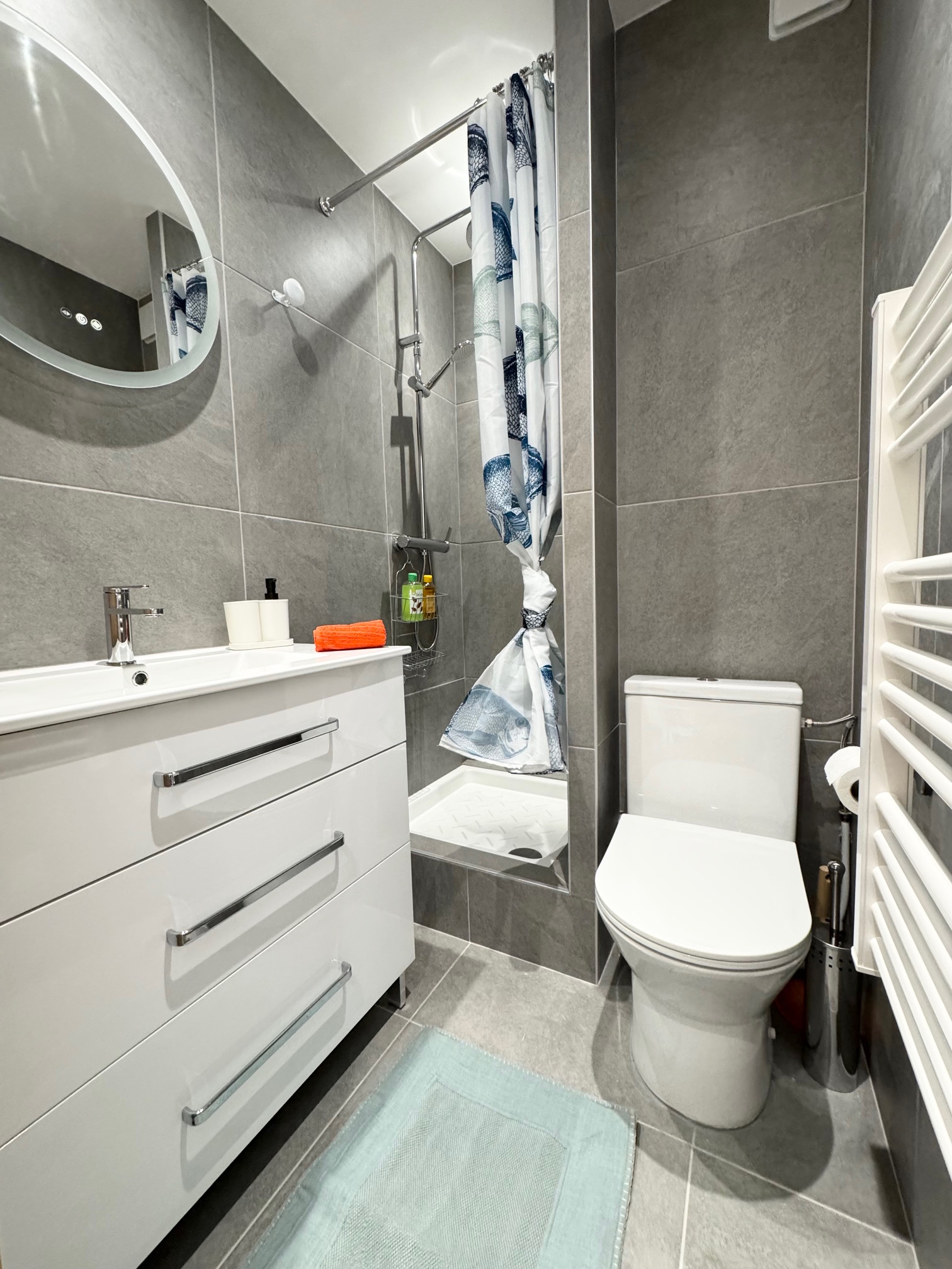 La salle de douche est équipée d’une douche, d’un meuble avec une vasque, un miroir lumineux et un sèche serviette.